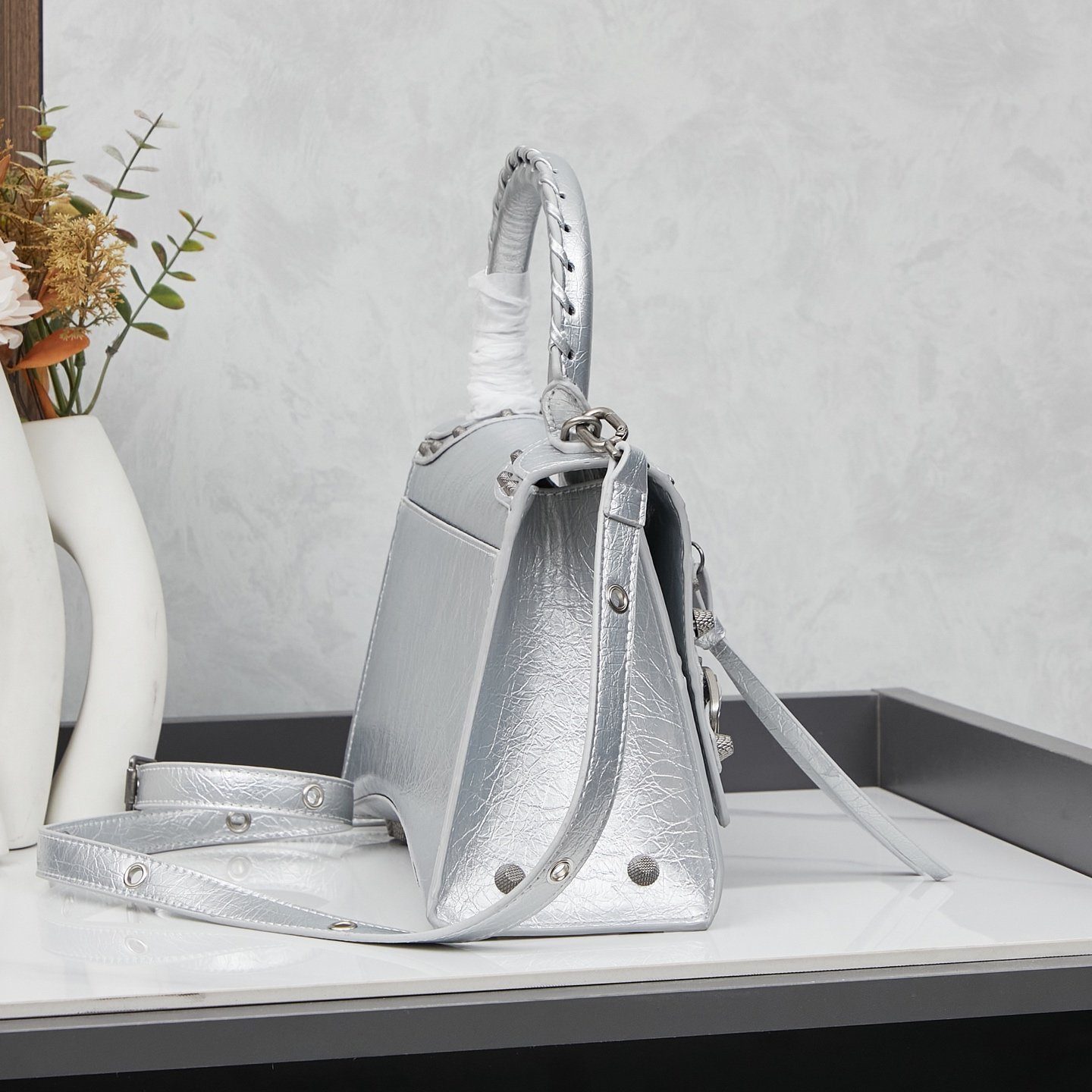 Have you heard of the collaboration between Balenciaga’s Hourglass bag and Motorcycle bag? Look at this combination of Hourglass bag and Le Cagole #Motorcycle bag#. The Hourglass bag body is studded with rose nails like those on the Motorcycle bag. The black Arena lambskin is full of punk style and quite interesting. Size: 27x18x11. Model number: 68630.