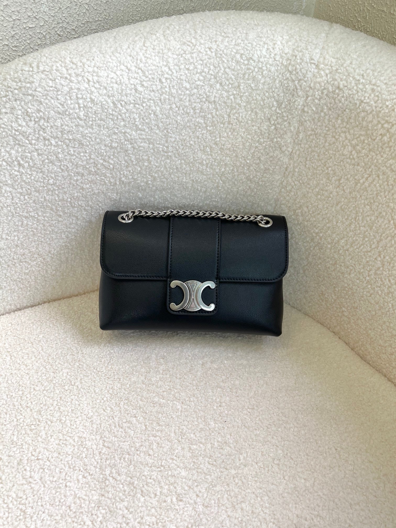 The newly released Victoire chain bag is crafted with textured leather to create a square silhouette and is paired with a golden sliding chain shoulder strap, exuding the style of a Tomboy cool girl. Another Tily handbag features a playful crescent silhouette that sets off the Triomphe emblem, revealing the sweet charm of a girl next door.