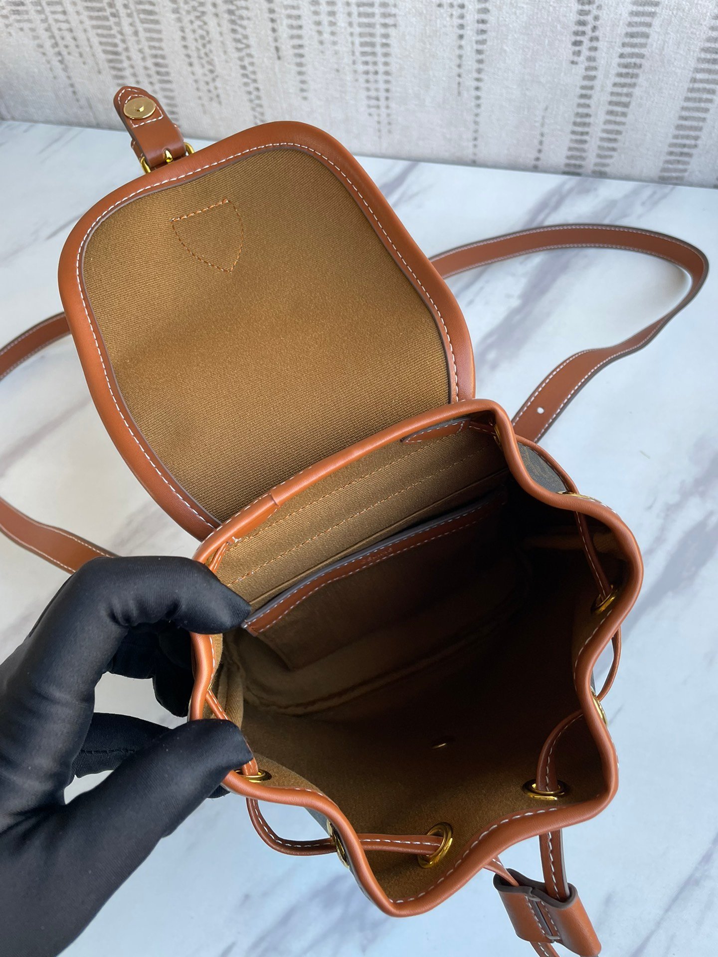 Calfskin trim, fabric lining, can be carried by hand, handle length (8 cm)