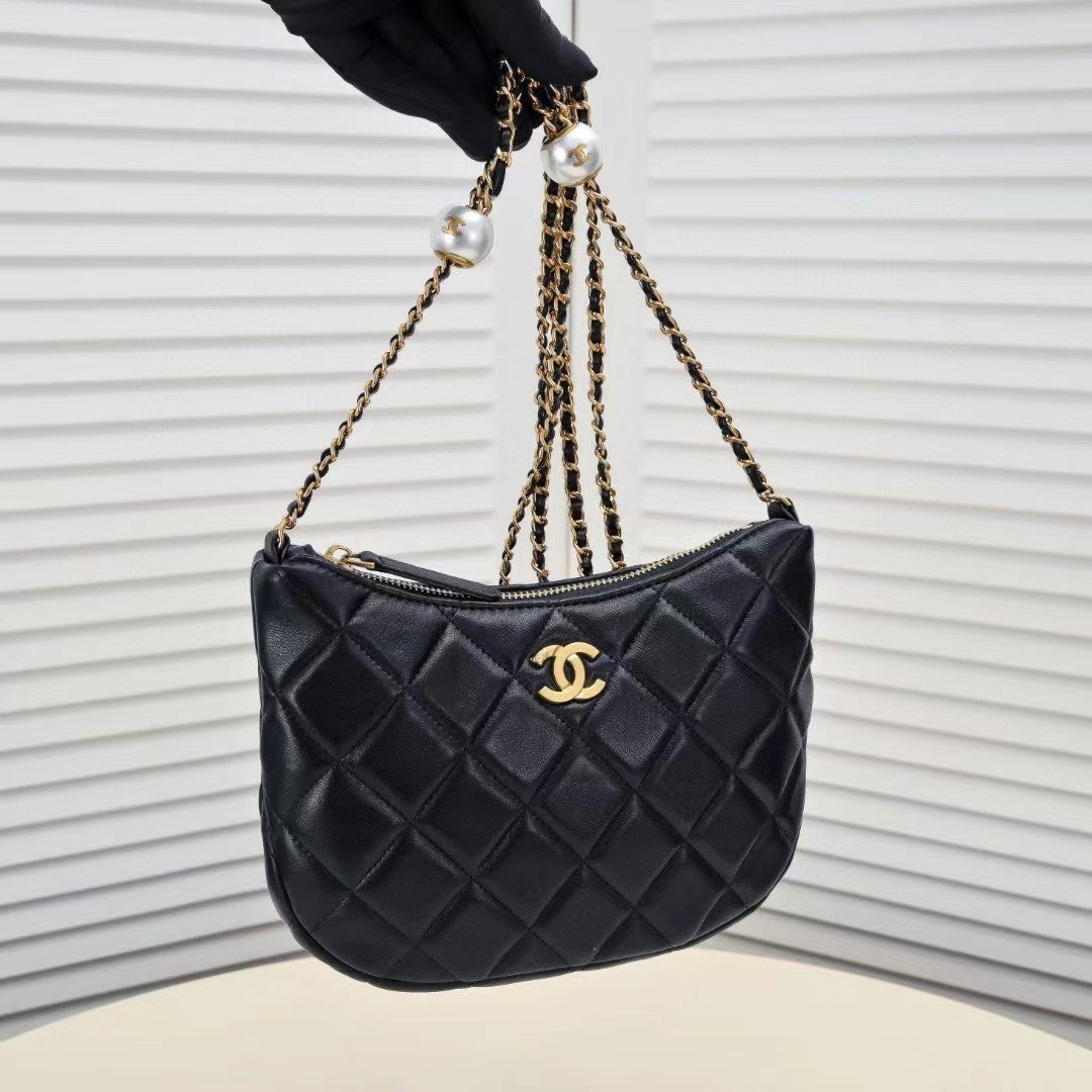 CHANEL 24S pearl-adjustable buckle hobo bag. Delicate and plump sheepskin continues the previous classic shape. The pearls are changed. The chain has a double-pearl adjustable design, which is more novel and unique. There is also a small double C embedded on the pearl ball. It is simple, atmospheric and very delicate! Size: 23.5*17*6 cm. Model number: 9038.