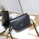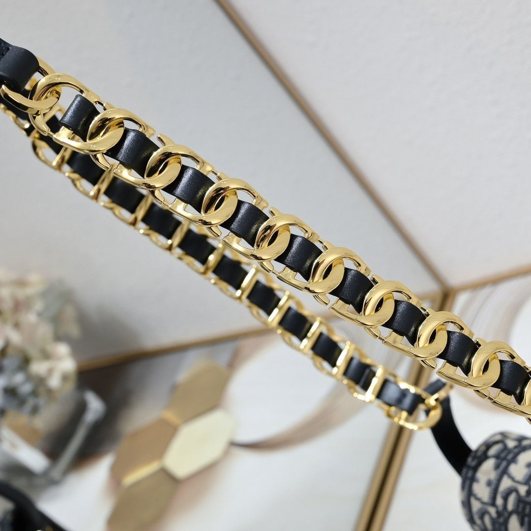 The latest Signature series combines modern style and elegant charm. It is carefully crafted from black cowhide leather. The front is decorated with a unique large logo embossed mark. It is matched with a chain shoulder strap made of intertwined letter logo chain links and leather, full of high-end feeling. Size: 21*6*12cm.