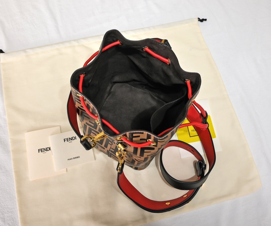 Shipment! Shipment! Shipment! ✨ Medium-sized MON TRÉSOR bucket bag. 👉8897💗 Drawstring closure decorated with metal decorative pieces in the shape of the FENDI logo. Equipped with a long shoulder strap that can be adjusted in length for shoulder or diagonal carrying. Made of black embossed calfskin🐂 and decorated with a red circular cowhide printed logo. Palladium-plated metal accessories🔱. Model 8897. Dimensions 17/15/25 cm. The shortest shoulder strap is 19 cm and the longest is 115 cm.