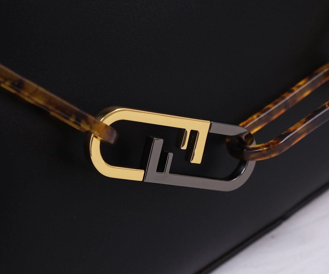 Super subversive new O’Lock handbag is coming! It is printed with the classic FF pattern in dove gray. The style with a mix of gold and black is more novel. It is also equipped with double handles and a detachable leather strap!! The tortoiseshell effect plexiglass chain decorated handle is extremely unique. It can be carried by hand or under the armpit.