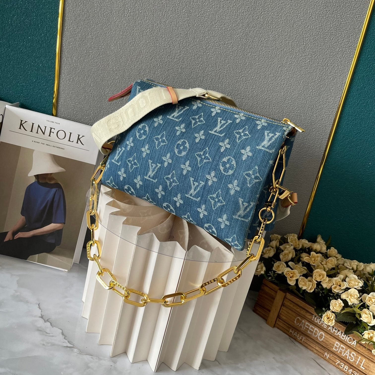 Upgraded version. M57790 M24564. This small Coussin handbag features a fresh and elegant vibe with the new season’s cotton denim. It achieves a unique look through bleaching and sand washing processes. Equipped with a detachable thick chain with engraved logo and a wide fabric shoulder strap, the lightweight carrying experience is once again upgraded. Size: 26 x 20 x 12cm.