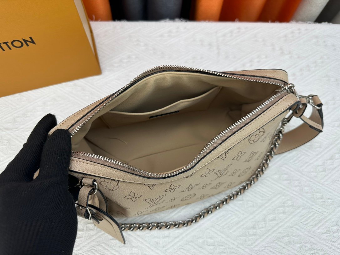 This Mahina Hand It All handbag is made of delicate perforated cowhide leather. Its elegant draping texture highlights the unique bag silhouette. The leather shoulder strap and the chain leather braided handle are both detachable, providing a trendy choice for daily outings. 29.0 x 18.0 x 13.0 cm (length x height x width). Perforated cowhide leather. Cowhide leather trim. Microfiber lining. Interior patch pocket. Metal studs. Shoulder strap.