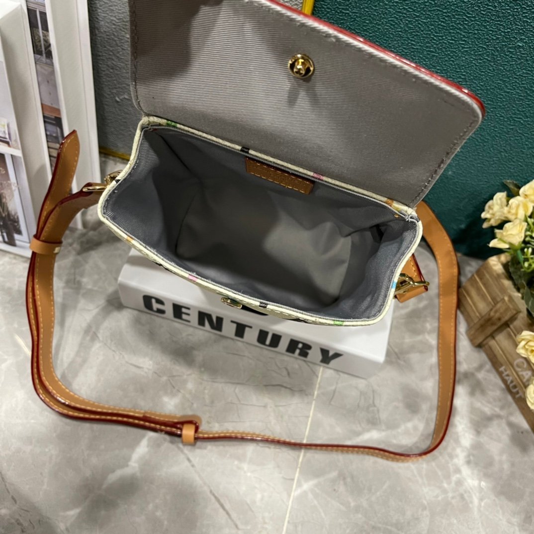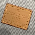 The handbag is from the brand’s collaboration series with Tyler. It presents a pocket-sized version of the Steamer handbag in Monogram Craggy canvas. The artist gives the Monogram pattern a hand-painted look. Cowhide leather shapes and reinforces the corner guards, shoulder strap, and flap.