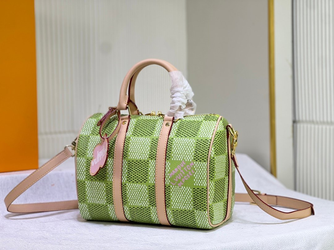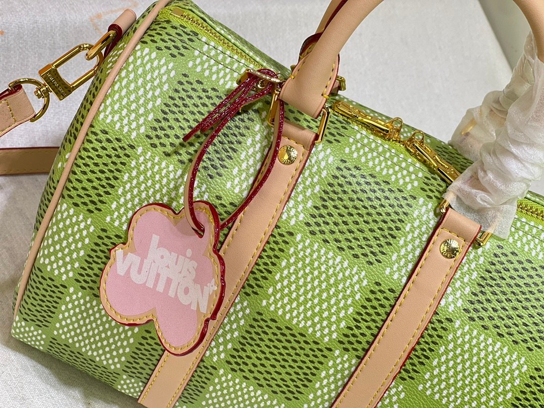 This Keepall Bandoulière 35 handbag is from the brand’s collaboration series with Tyler. It is made of Damier Golf coated canvas with cowhide trim. Louis Vuitton floral decorations highlight the details. The Marque L.Vuitton déposée logo is integrated into one of the Damier check patterns. Dimensions: 25x15x11cm.