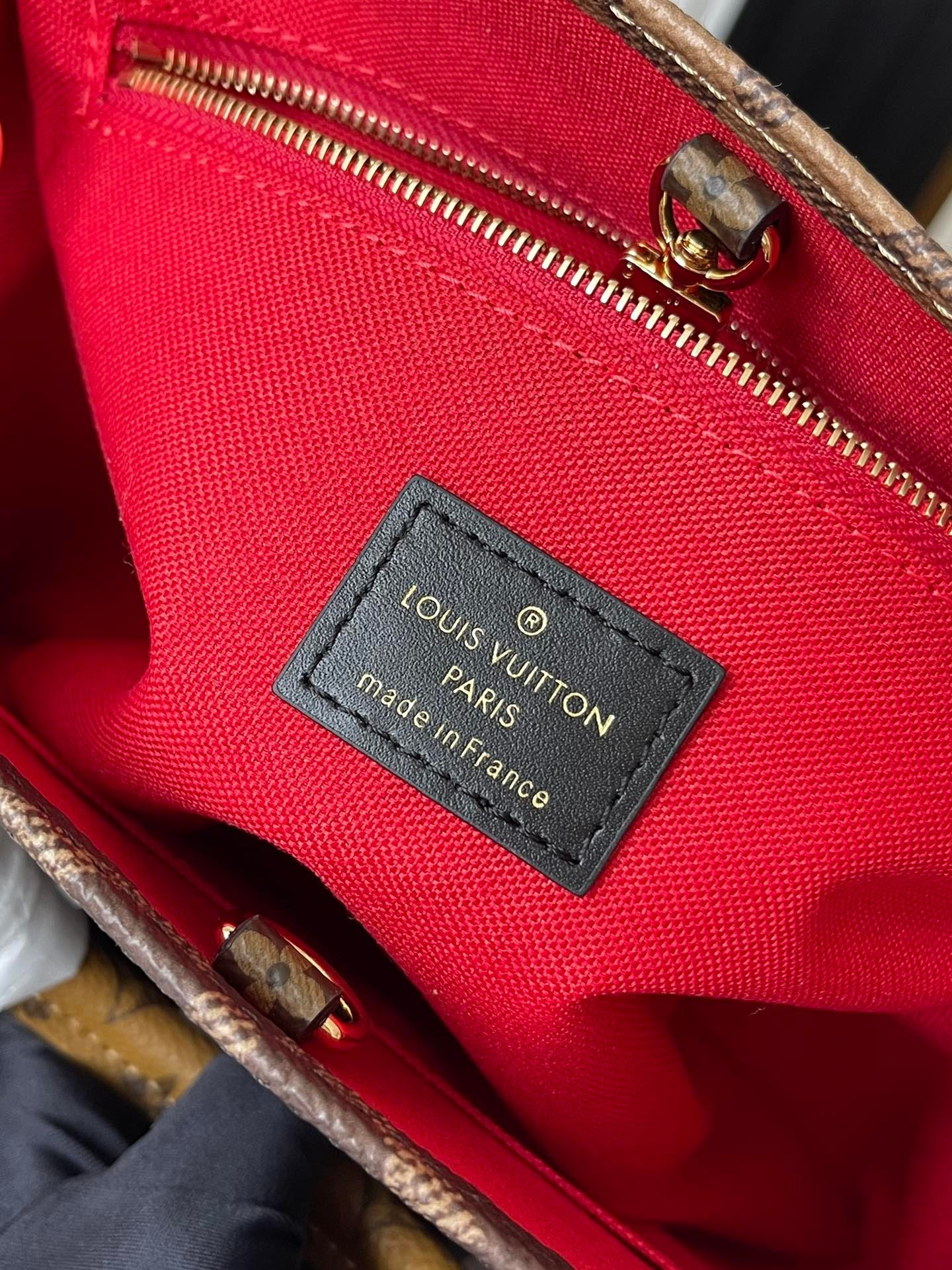 M46373 vintage, Mommy bag series. This OnTheGo small handbag combines Monogram and Monogram Reverse canvas, and the Monogram Giant pattern is embellished on it. The Toron handle and the jacquard woven shoulder strap decorated with the brand’s inscription create a visual contrast. The detachable change purse is suitable for storing change or small delicate items. With both fashionable charm and diverse functions, it becomes an excellent daily companion. 25.0 x 19.0 x 11.5 cm.