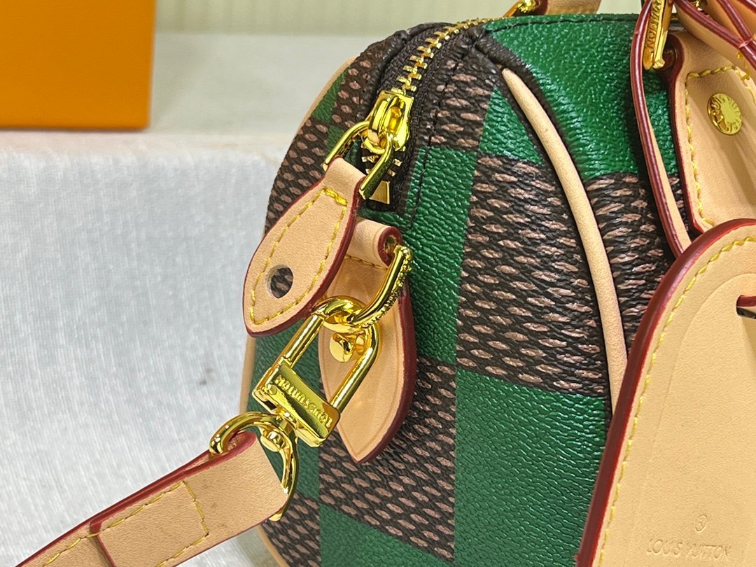 The handbag interprets the Speedy handbag of the 1930s with an exquisite design. It uses the Damier Pop coated canvas created by creative director Pharrell Williams to outline the classic lines and renders bright colors for the Damier checkerboard pattern. Size: 18x12x10cm.
