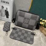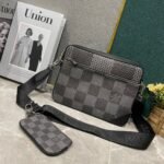 The upgraded versions M69443, M50017, M50027, M45320, and M69827. The new Trio messenger bag is made of Monogram Eclipse canvas and Monogram Eclipse Reverse canvas. The iconic monochromatic grey pattern highlights the lines of this multi-functional patchwork design. In addition to the functions of a traditional crossbody bag, it is also equipped with a detachable zipper bag and a coin purse attached to the strap. Dimensions: 25.0 x 18.5 x 7.0 cm.