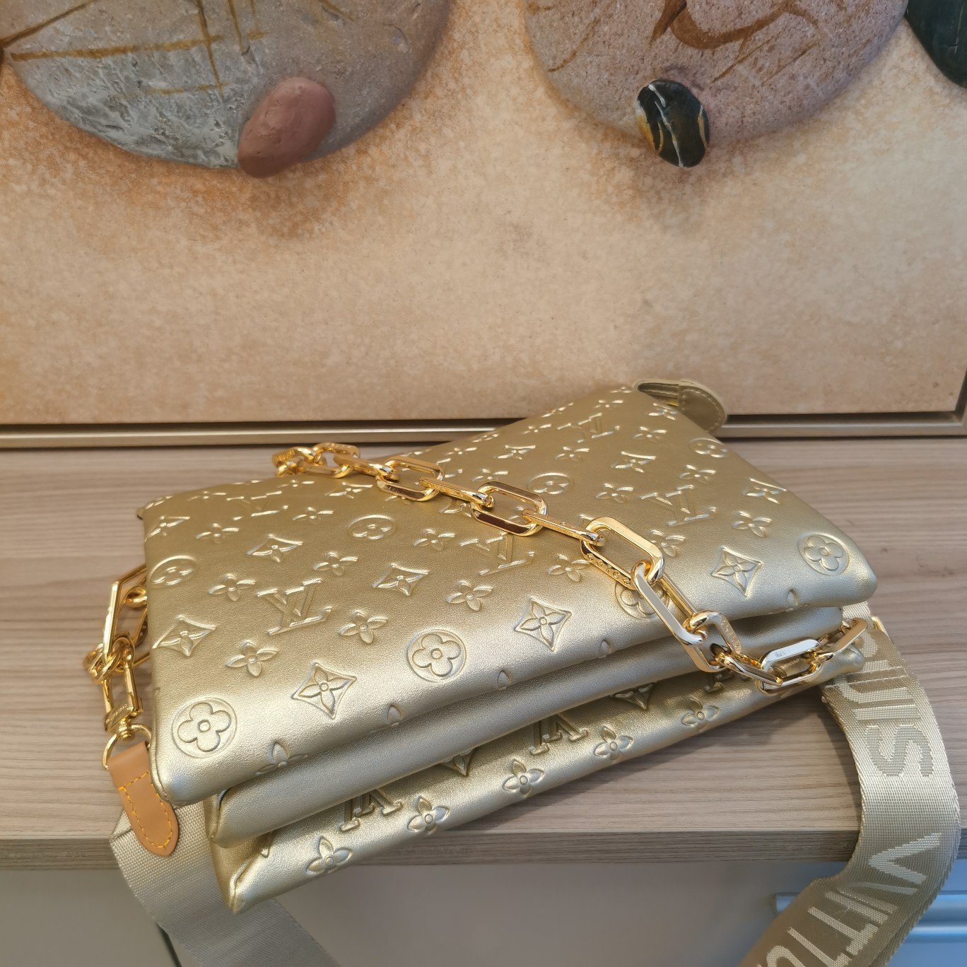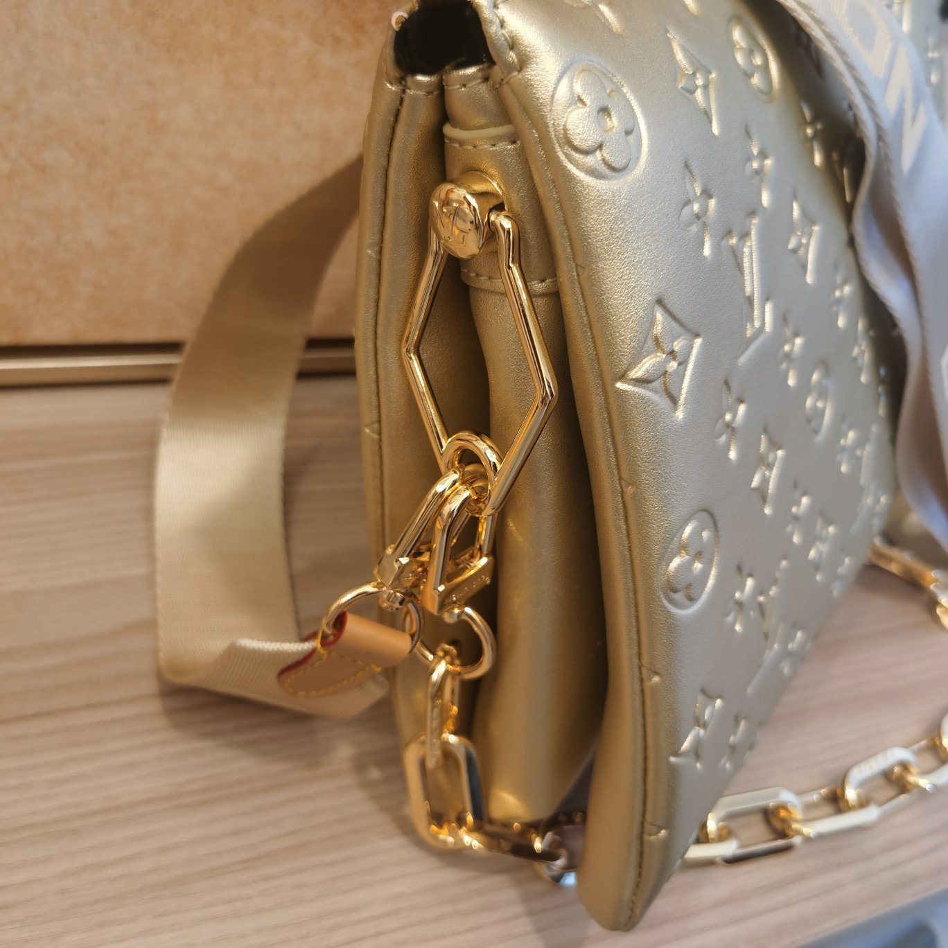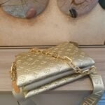 The top-of-the-line original M57793 57790 apricot Coussin small handbag shines at the Spring/Summer 2021 fashion show. Monogram embossed fluffy sheepskin creates a pillow configuration that injects avant-garde style into the minimalist design. Can be carried under the arm with a strap crossbody or an avatar chain baguette bag. Dimensions: 26 x 20 x 12 cm