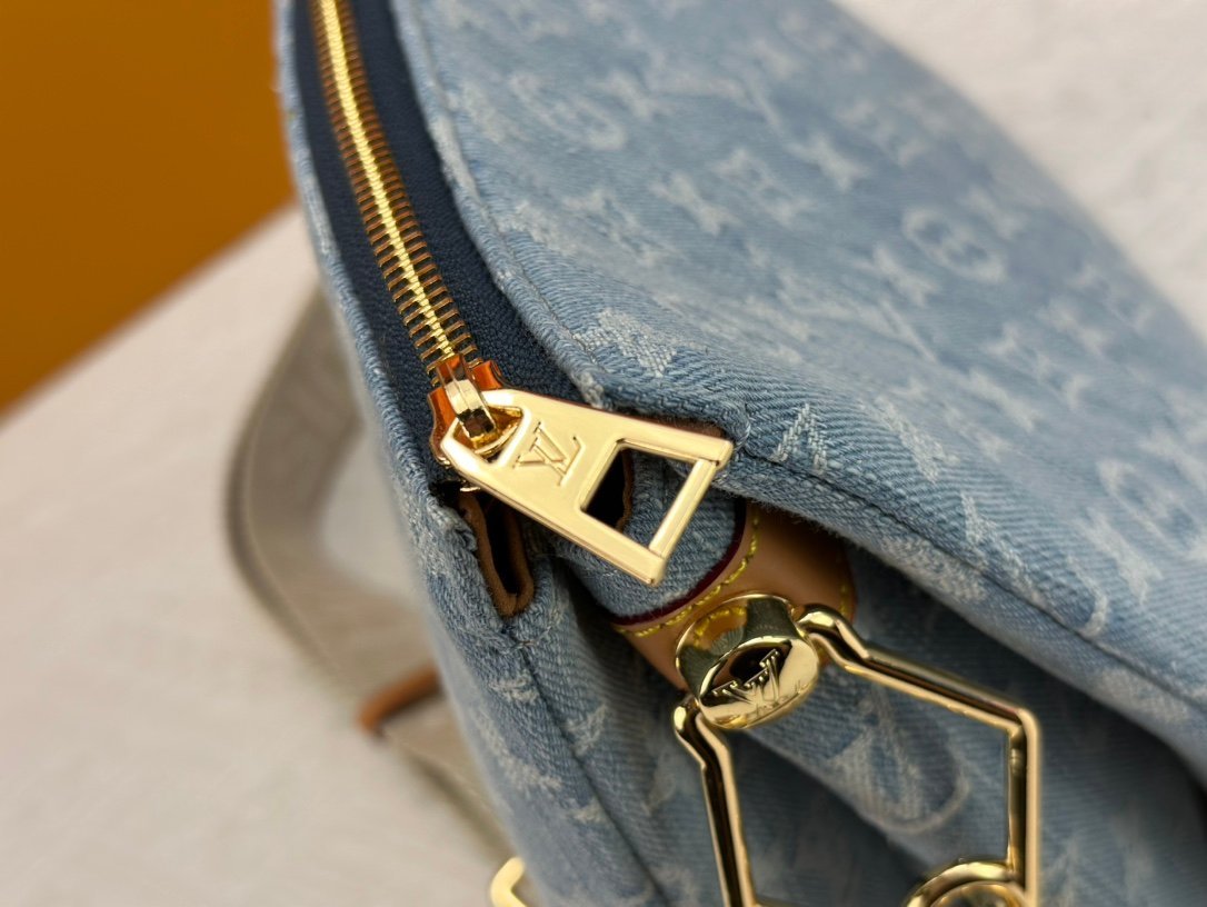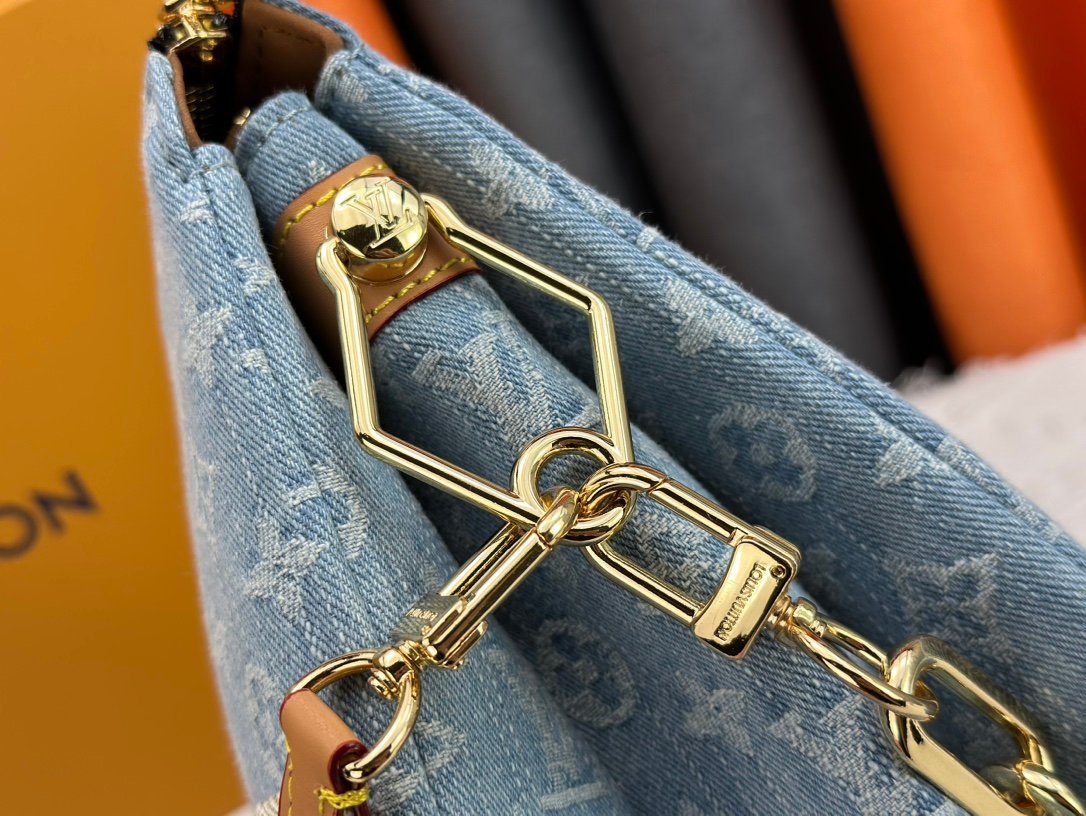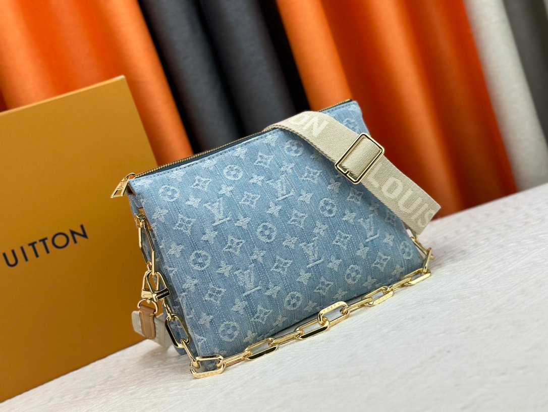 M57790. This small Coussin handbag features the Monogram pattern woven into cotton denim fabric. It presents the Monogram Denim pattern through bleaching and sand washing processes, vividly showing summer charm. The rugged chain and leather shoulder strap are both detachable. Size: 26x20x13cm.