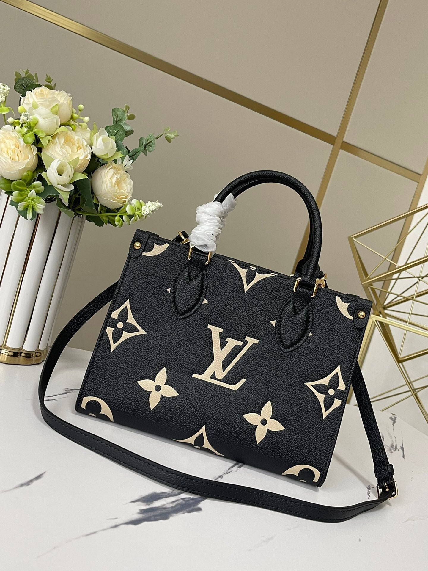 M45659 Onthego small Tote bag draws inspiration from the classic Sac Plat handbag in 1968. The Monogram Empreinte leather with the embossed Giant Monogram pattern creates a miniature version. It can hold daily necessities such as iPad Mini. The flexible handle and adjustable shoulder strap enrich the carrying options. Size: 25x19x11.5cm