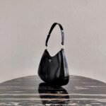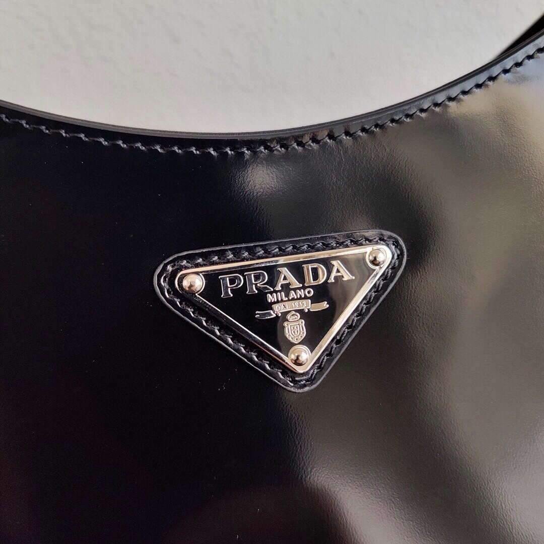 - The Prada Cleo bag with sophisticated allure reinterprets an iconic design of the brand from the nineties. The sleek. curved lines emphasized by the particular sloped construction of the bottom and sides give this hobo bag a soft. light look. Brushed leather. a distinctive element of Prada collections. is a modern and versatile material that lends itself to always new combinations and contrasts. The enamel triangle logo refines the silhouette.