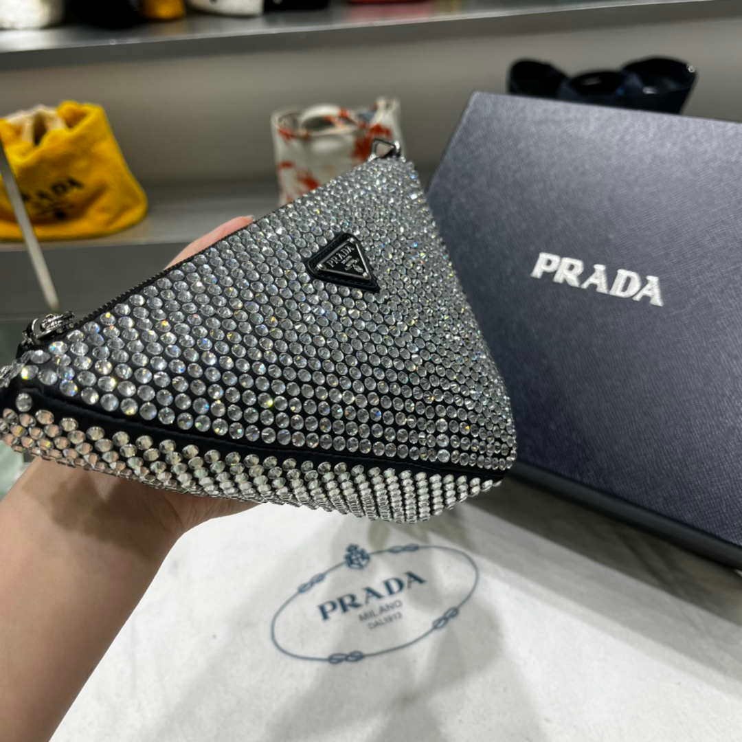 An all-over crystal embellishment creates plays of light and iridescent glimmers. A study on the triangle inspires new geometric shapes and novel interpretations of Prada’s iconic symbol. The triangular shape inspires the design of this satin pouch with an adjustable leather handle.