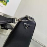 A study of the triangle inspires new geometric elements and novel interpretations of Prada’s historic stylistic code. The iconic shape is presented again in this shoulder bag with sleek lines that comes with a strap for versatility. The tonal embossed logo and the enameled metal triangle logo on the back enhance the minimalist aesthetics.