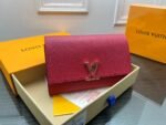 M62157 is crafted in Taurillon leather, and this Capucines mini purse is versatile and spacious to accommodate everyday belongings. The elegant bag wallet’s construction is ingeniously original and consists of two folding vertical lids, providing plenty of room for credit cards, change and banknotes. Size: 13.5 * 9.5 * 1.5cm