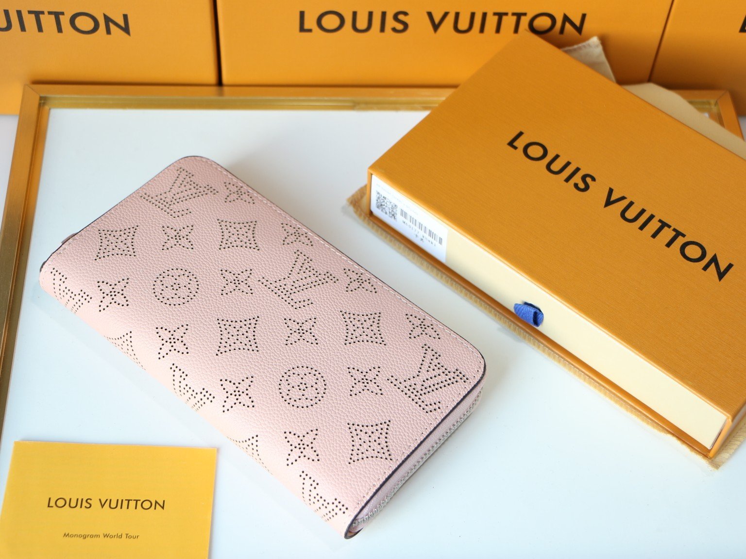 P M58429/M61867 This zipper wallet is made of soft Mahina punched through flower Monogram calf leather. It is known for its secure full zipper design. It is equipped with multiple pockets, compartments and credit card interlayers. The design is highly functional and can be carried as a handbag. Size: 19.5 * 10.5 * 2.5cm